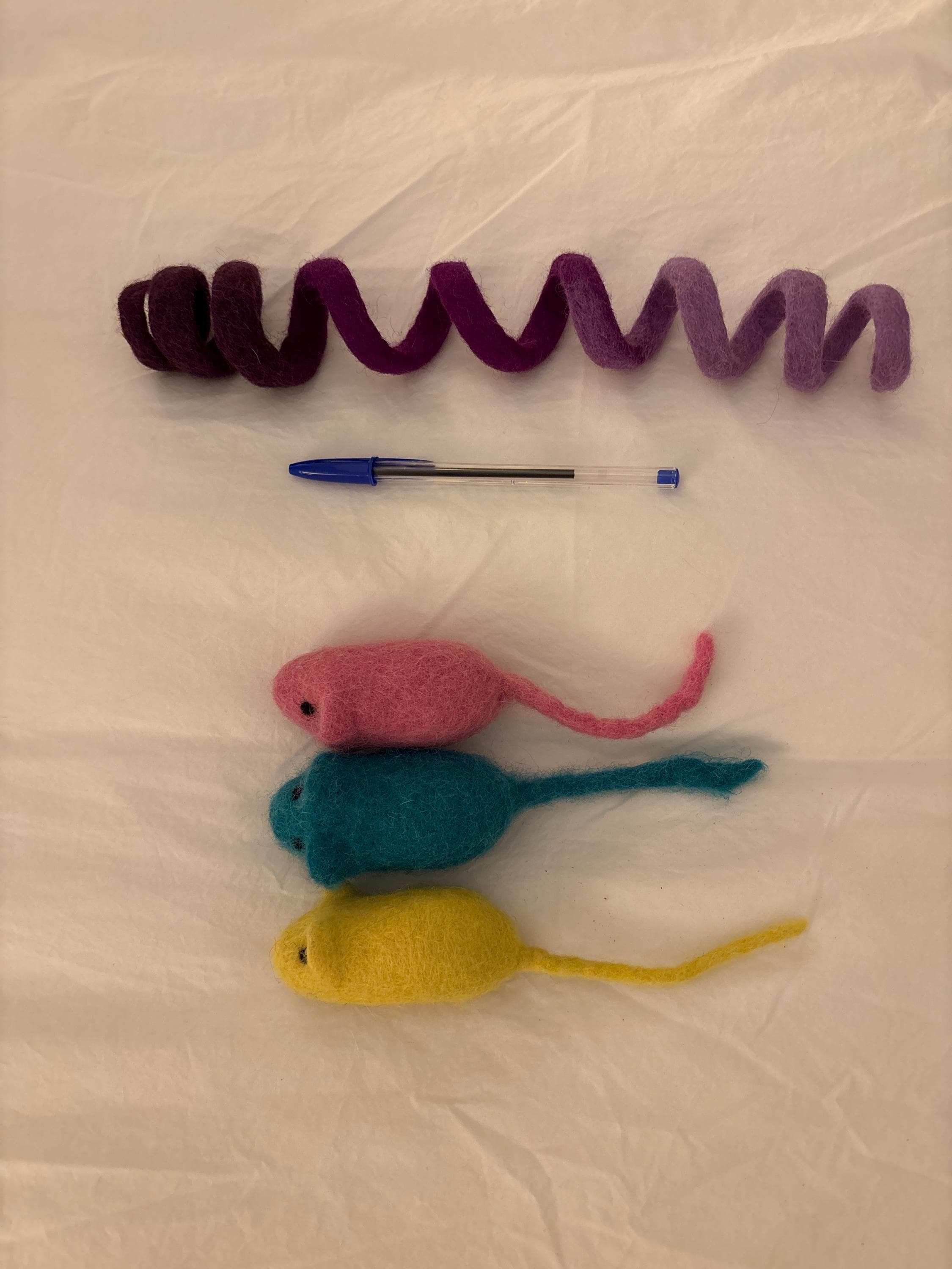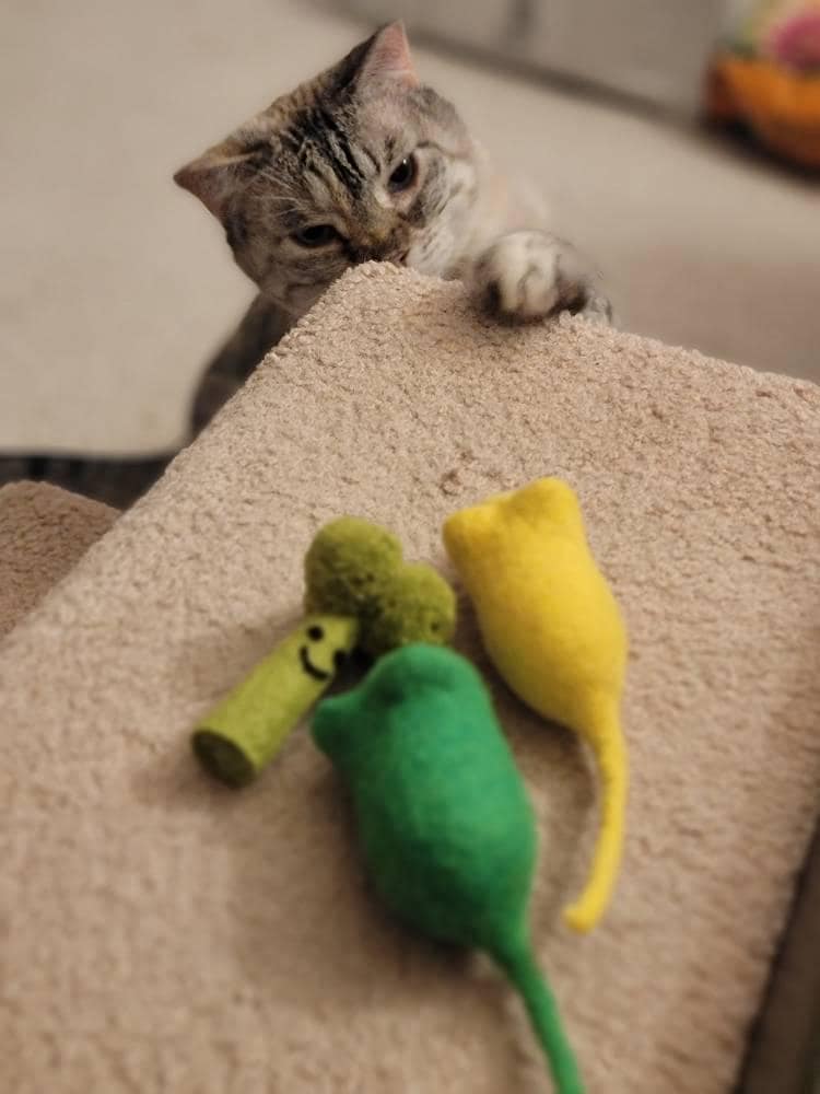 These mouse cat toys are 100% solid wool and are catnip infused.