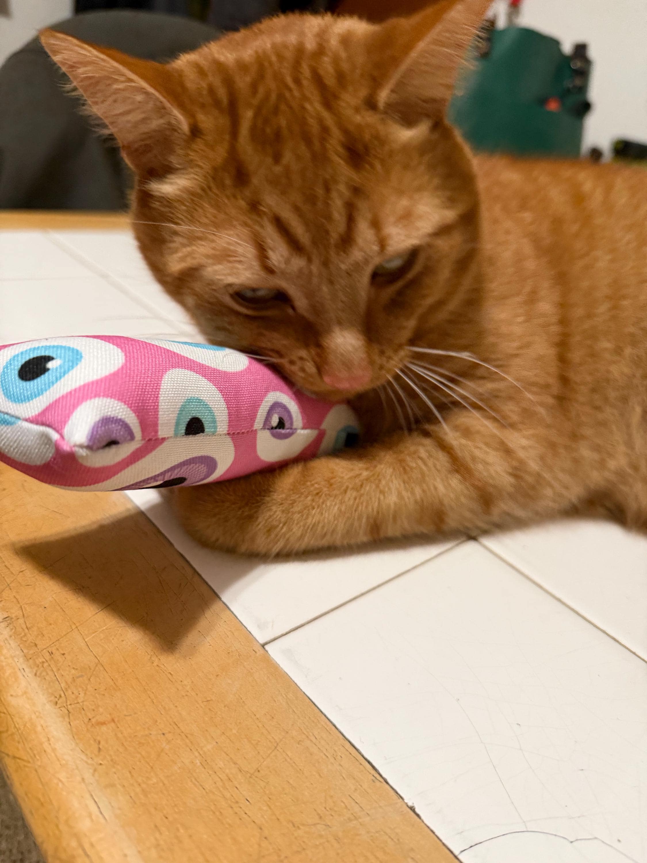 This fabric is printed with water-based inks that are baby safe, so your kitty can kick and chew safely all day long.